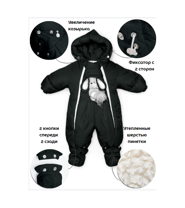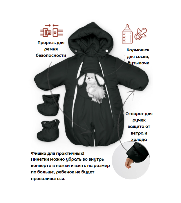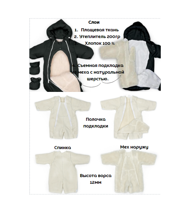 Комбинезон-трансформер детский зимний. Изготовлен из водонепроницаемого, не продуваемого, сверхпрочного материала и утеплен съемной подкладкой, в составе которой натуральная овечья шерсть. Он прослужит вашему малышу не один сезон, в зависимости от возраста вашего малыша и погодных условий вы можете использовать изделие как конверт или комбинезон. В режиме конверт модель идеальна для новорожденных, позволяет не тревожить малыша при одевании и раздевании во время сна, при желании с помощью молнии конверт легко трансформируется в комбинезон. Когда потеплеет, вы можете снять шерстяную подкладку, и комбинезон подойдет для весенней погоды. Отвороты на рукавах заменяют варежки, которые согреют маленькие ручки вашего малыша в холодную погоду. Плотно прилегающий к голове капюшон защитит от сильного ветра за счет вшитой утягивающей резинки. В комплекте идут отстегивающиеся пинетки, которые, будут греть ножки, и не будут выделяться из общего стиля.